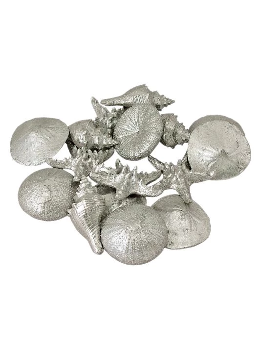 Add a coastal touch to your bathroom or living room with this set of 12 decorative seashells. The modern Ambered Silver Leaf finish fills the cervices of each shell, providing a life-like rendition.