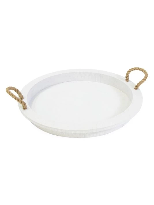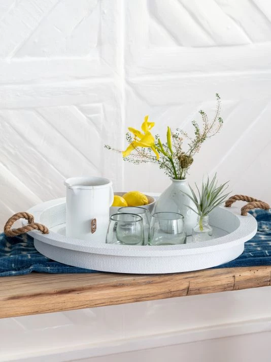 Inspired by Ancient Greece, the Aegean tray wears a white faux rattan finish with complementary jute rope handles. This tray would fit seamlessly into your coastal, farmhouse or cottage decor.
