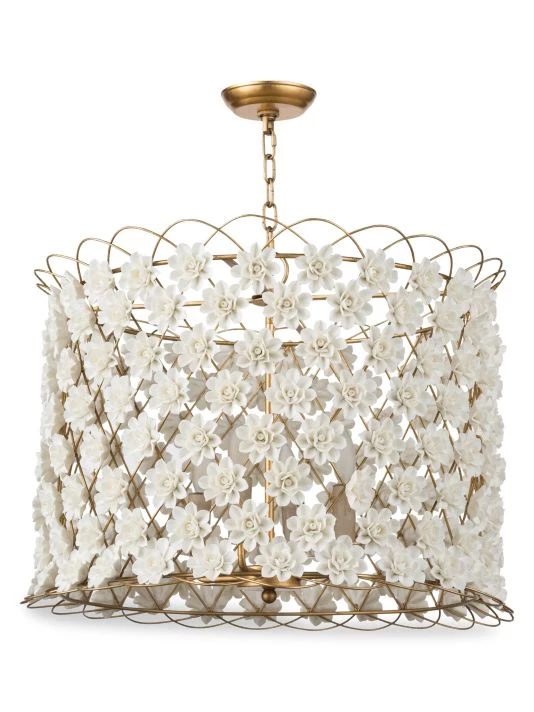 Created with gold leaf wireframe construction, this pendant light features matte white, non-glazed porcelain flowers that glow from within.