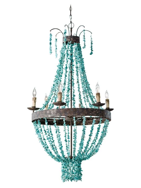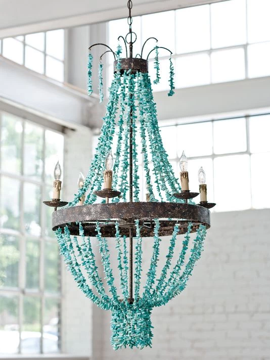 Casual and fun, this chandelier brings mixed materials to your coastal decor. An iron frame offsets strands of turquoise beads that act like jewelry for your ceiling, and antique-inspired candles add a vintage detail. Hang in a living room as a centerpiece.