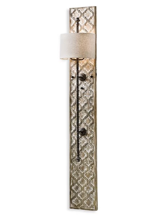 Textured and exuding a regal appeal, the Carved Panel sconce evokes an aspirational charm. The aged white wash finish of the quatrefoil pattern wooden panel, perfectly pairs with the rustic blackened iron arm, an oatmeal shade completes the design. The sconces comes with a corded plug but it can be easily converted into a direct wire if desired.