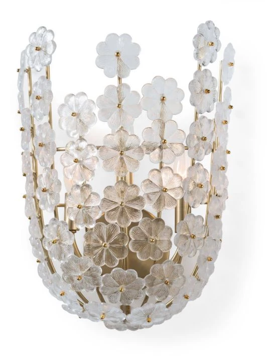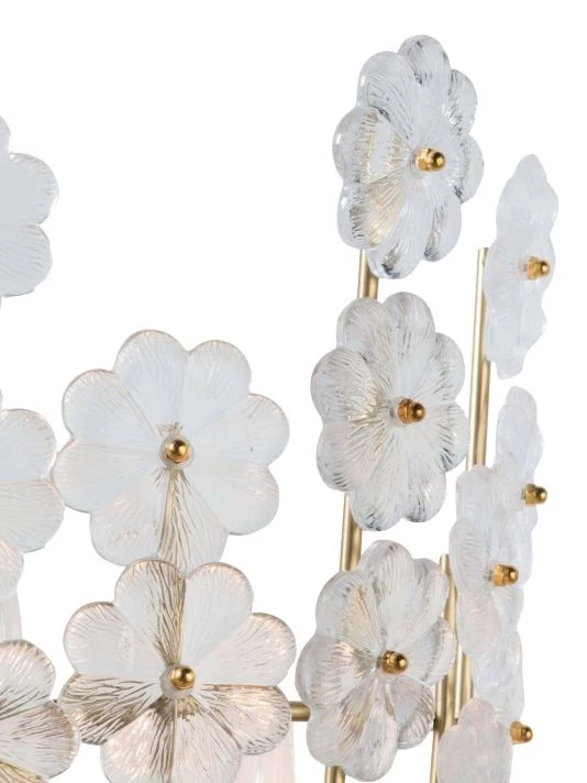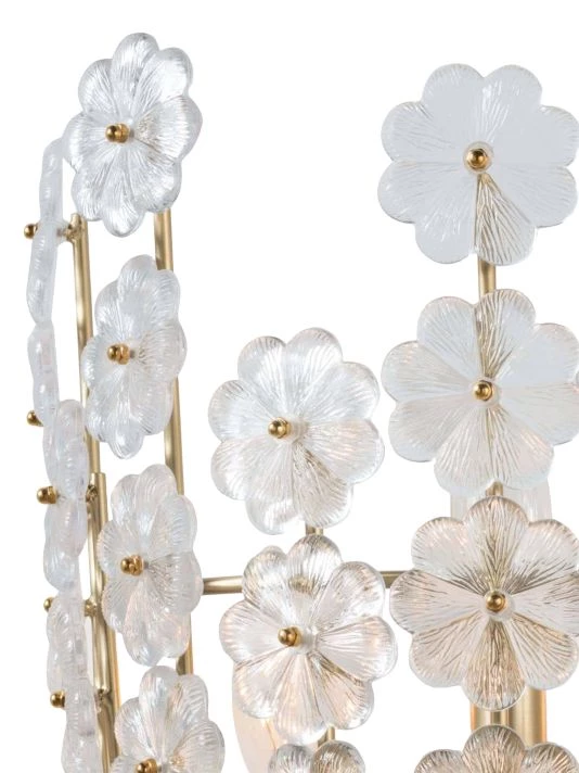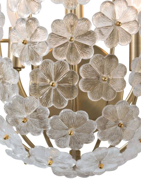 From the Classics Collection. Even more beautiful in person, the detail on the cast glass flowers is breathtaking. Carefully crafted this natural brass fixture is light and airy, will add a feminine sophistication to an entryway, foyer or dining room.
