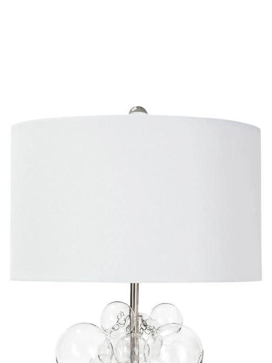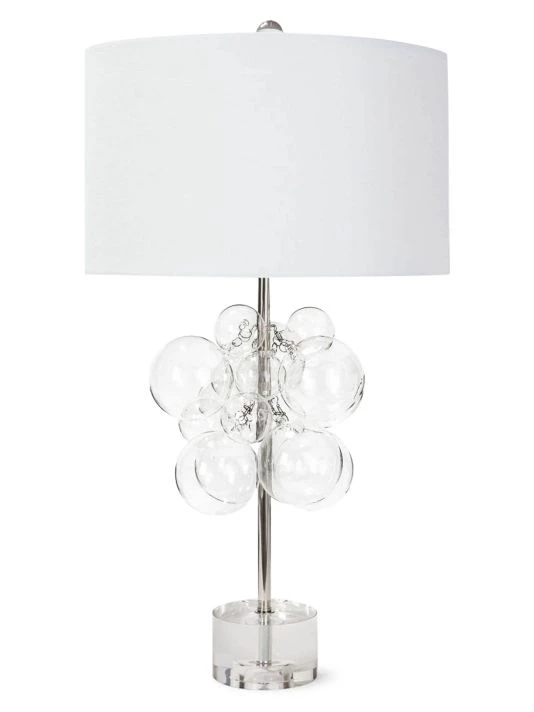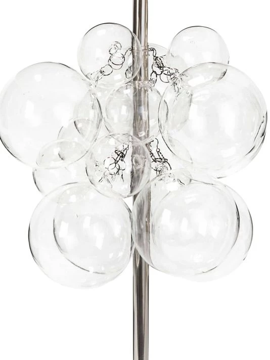 Clear glass spheres adorn the skinny polished nickel rod base, and the crystal pedestal sets the whole piece off luxuriously.