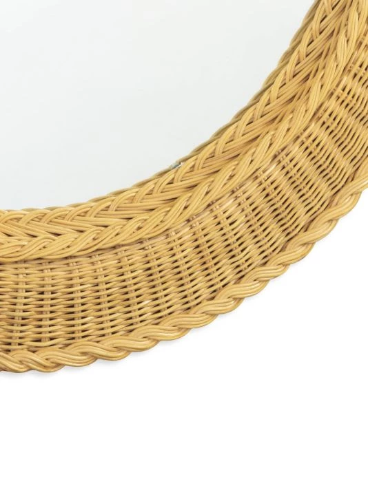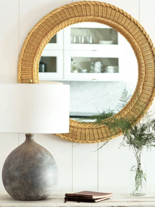 From the Coastal Chic Collection. The Pierre mirror has a beautiful, round basket-weave frame. Its wheat-colored frame has a coastal cottage charm and an organic appeal that would work well in a number of traditional settings. Add this mirror to a bathroom, powder room, in an entryway or bedroom.