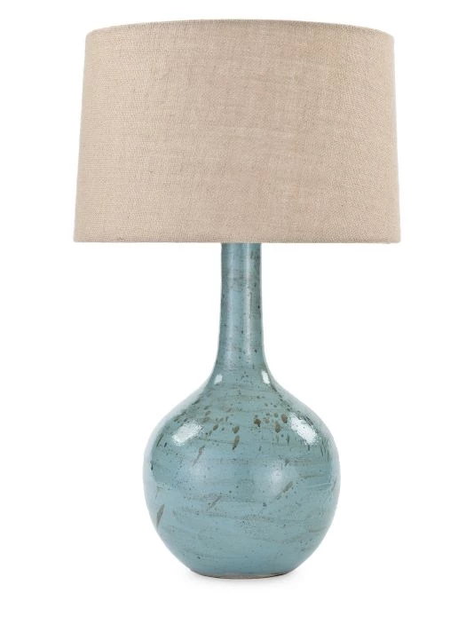 Mid-Century modern-inspired table lamp features a blue ceramic base that uniquely emulates a robin’s egg. A jute shade provides the perfect natural finishing touch.