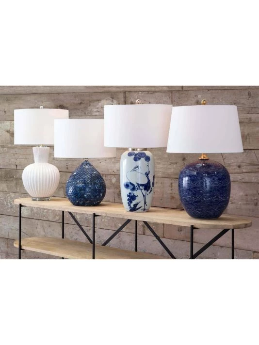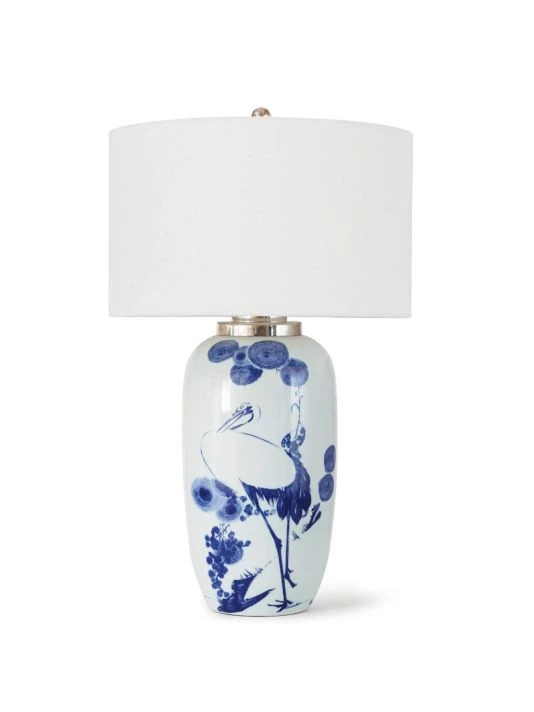 Inspired by the beautiful giant cranes often found depicted in Japanese calligraphy paintings. The gorgeous blue glazes are highlighted by the crisp white background and polished nickel cap and finial. Kyoto ceramic table lamp is modern juxtapositions on an ancient art form.