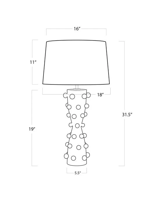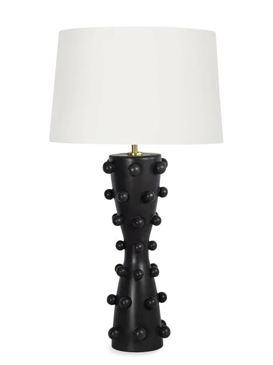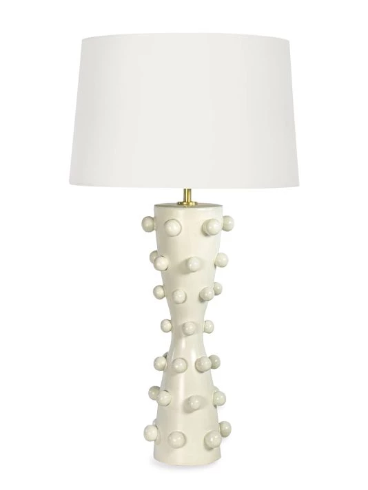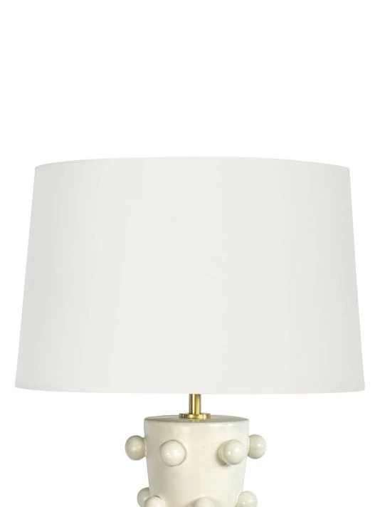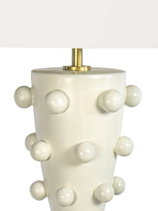 From the LA Modern Collection. A contemporary work of art in its own right, the Pom Pom Ceramic Table Lamp is both modern and fun, adding texture and drama along with functionality. Pom Pom’s elongated hourglass base is dotted with modern ceramic spheres, each hand formed and applied. It is finished with a crisp, natural linen shade and brass neck and ball finial.