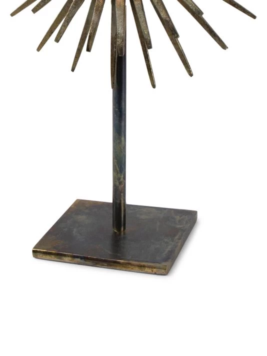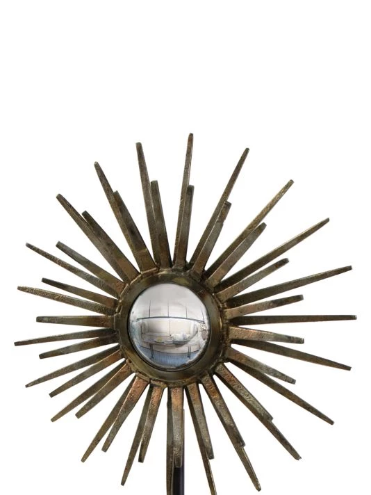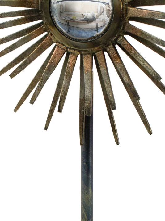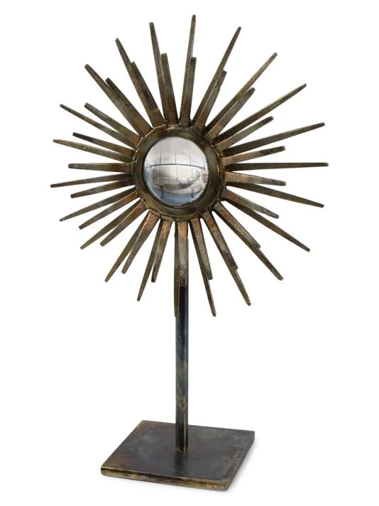 From the LA Modern Collection. The industrial-chic look of the radiant sculpture is made possible by its iron base and spiked mirror surround. The convex mirror creates a dreamy element that is sure to add interest to any table, shelving or display area.