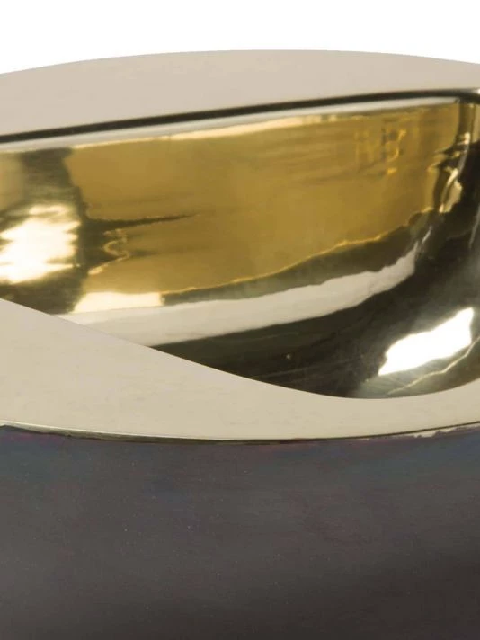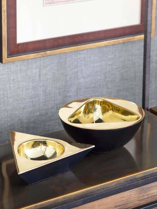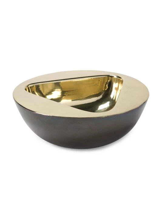 From the LA Modern Collection. This round metal dish plays on geometric silhouettes for a casually elegant statement with depth and dimension. Its two-tone metallic finish adds to its contemporary appeal.