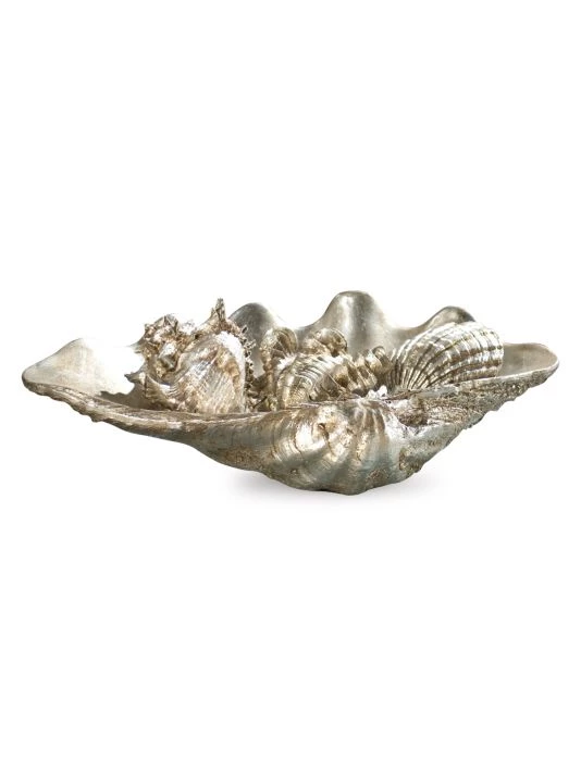This chic presentation bowl in the shape of a clamshell is made from shining metallic resin and includes several smaller shells.