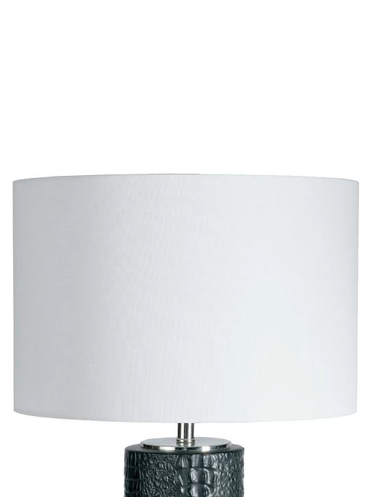 From the Modern Glamour Collection. The Blake Ceramic Table Lamp features a textured cylindrical body molded from real crocodile hide displayed on a polished nickel base.