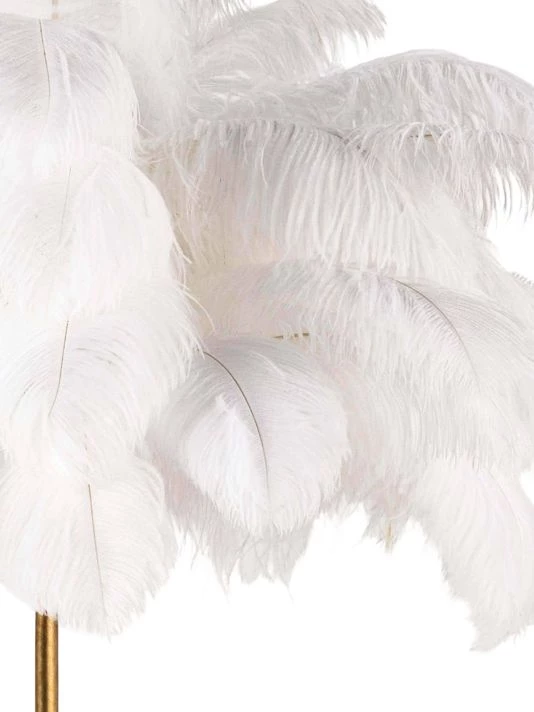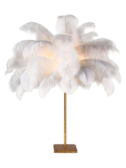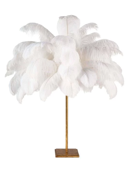 Romantic and feminine, this sultry lamp will make a statement in your bedroom or living room. Its elegant gilded base supports real, ostrich feathers.