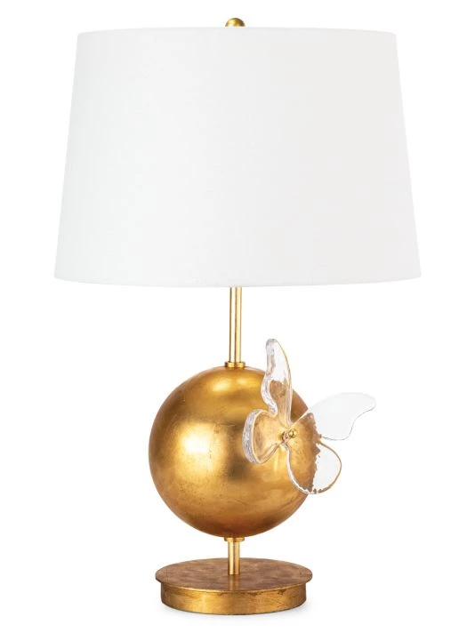 This whimsical Monarch table lamp features a glass butterfly suspended on the light gold leaf sphere. Finished with a tapered linendrum shade topped with a gold leaf finial, the piece stands securely on a cylindrical base.