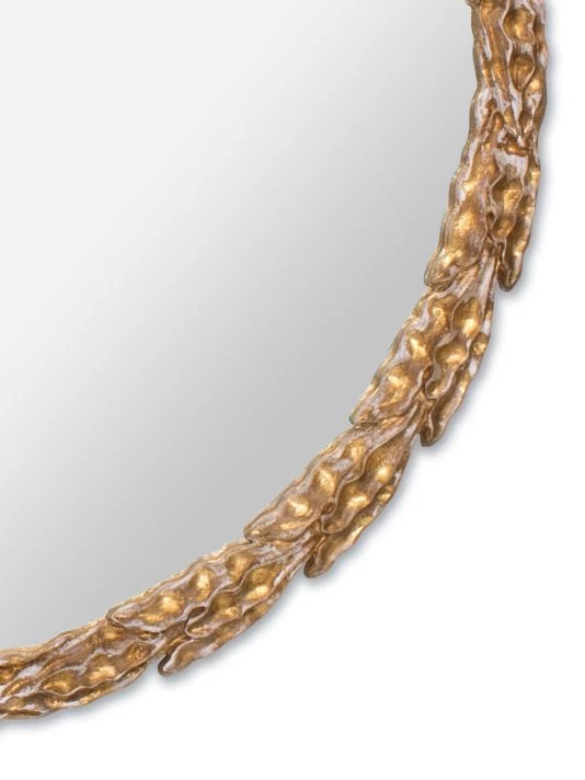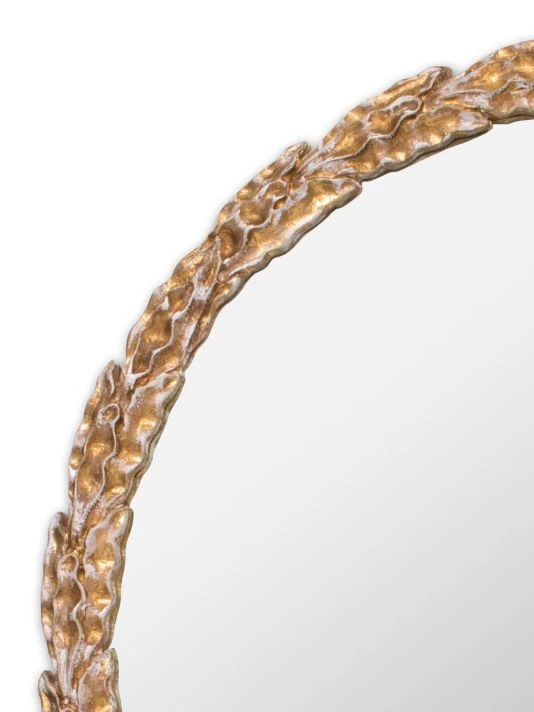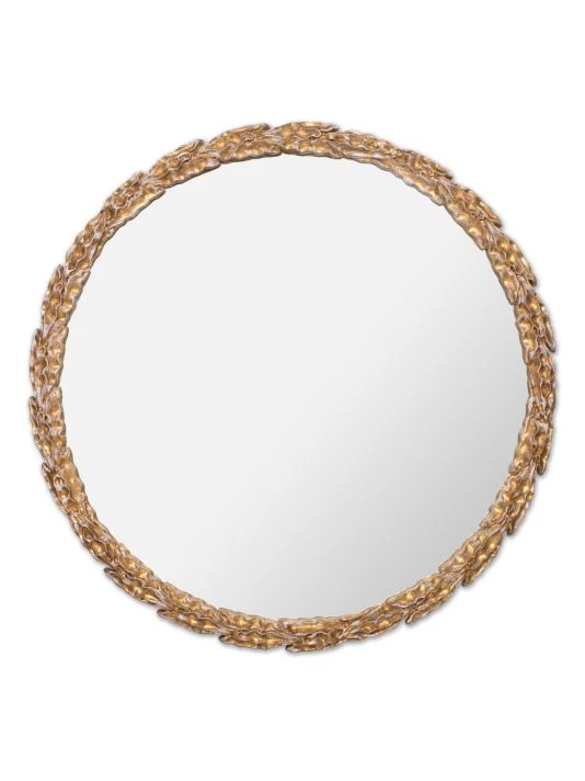 From the New South Collection. Inspired by the olive branch, this round gold leaf mirror can add a peaceful symbol to any room.