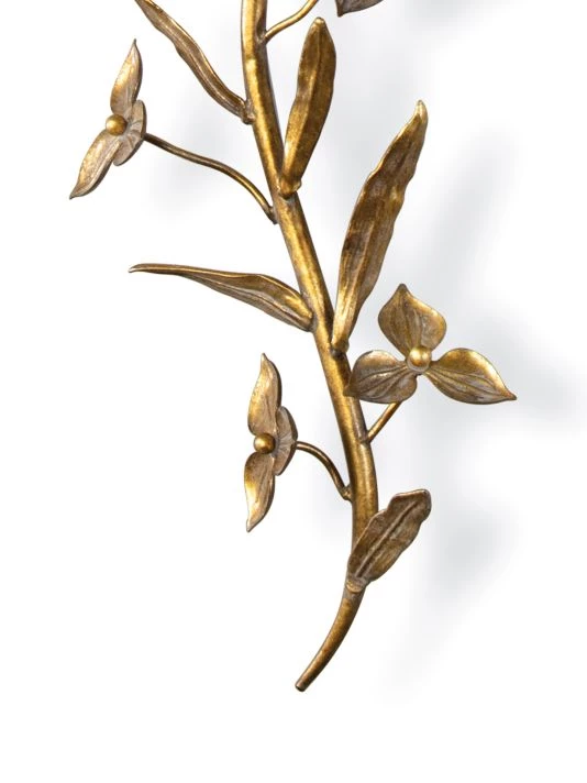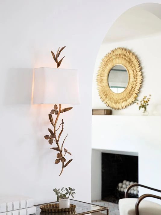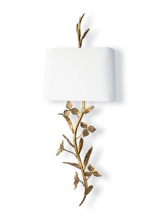 From the New South Collection. Balancing old world elegance with rustic charm, each branch of the Trillium Shaded Sconce is cast and gilded in a brass finish. Topped with a classic, natural linen shade and matching, cast brass finial.